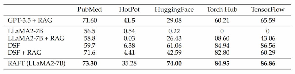 - 持续性优势:RAFT无论是在有RAG的情况下还是没有RAG的情况下,都持续优于现有的领域特定微调方法